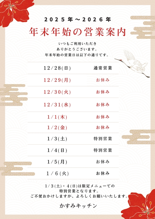 年末年始営業日のご案内